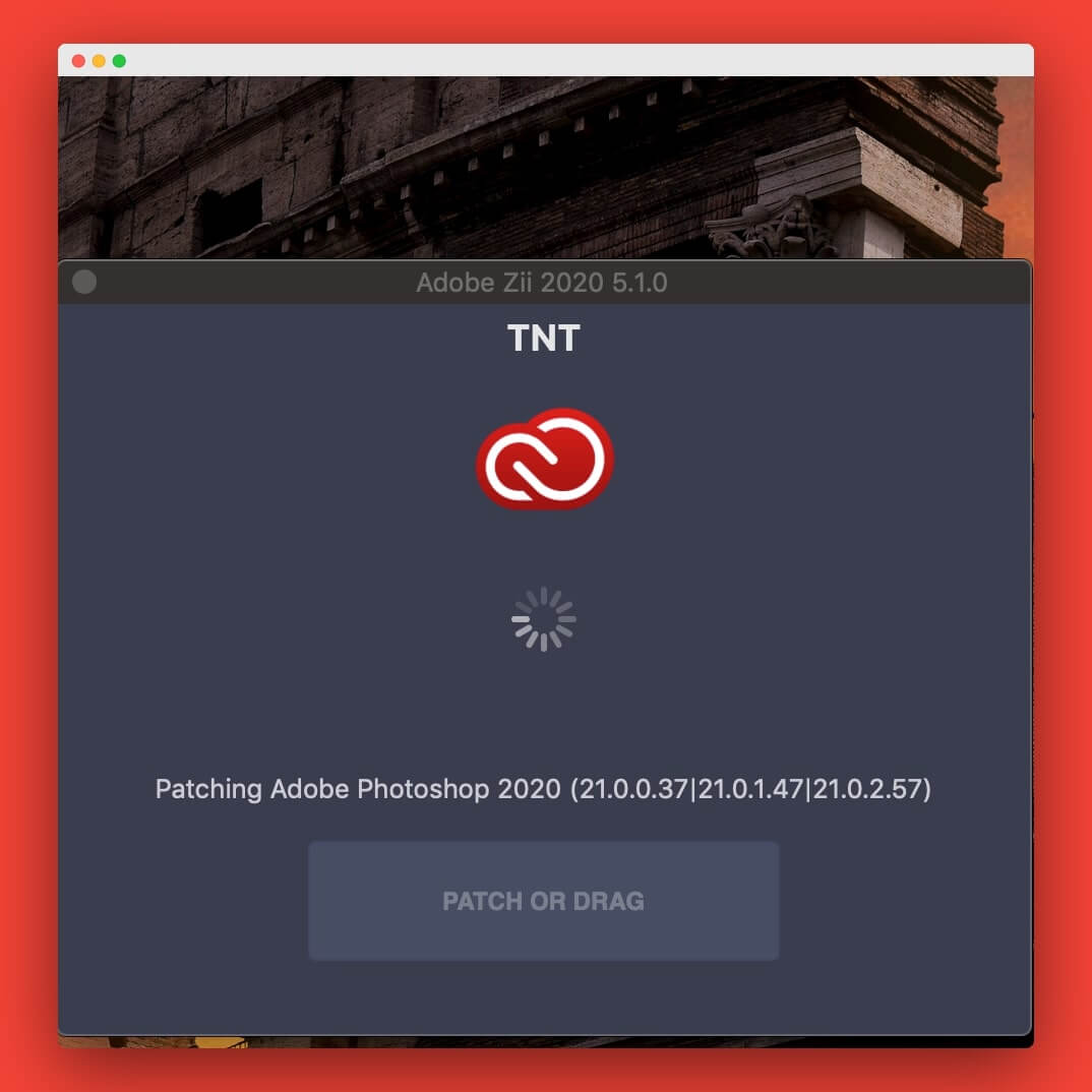 拖动 Adobe Photoshop 2020 应用程序到 Zii 的 PATCH OR DRAG处。